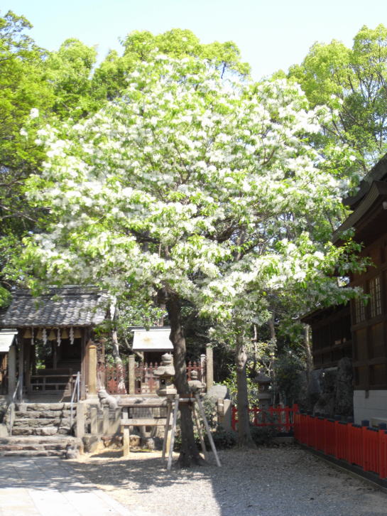 4月下旬、拝殿西側のナンジャモンジャが咲き始めます。
