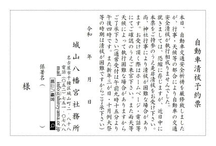 正月三が日、茅輪神事(7/15〜17)などは行事の関係により、自動車の交通安全祈祷の際、自動車お祓い所への入庫ができません。その場合、拝殿へお上がり頂いての御祈祷を執行のうえ、下記『自動車清祓予約票』をお渡しし、近日中にご来宮頂きます様お願いしております。